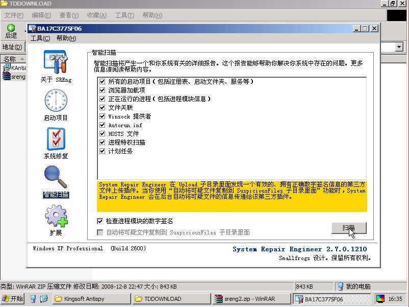 记住:将文件名的后缀.rar去掉,并把程序放到C:\Documents and Settings\All Users\「开始」菜单\程序\启动 中,重新启动用它(sreng)扫描一个报告上来。