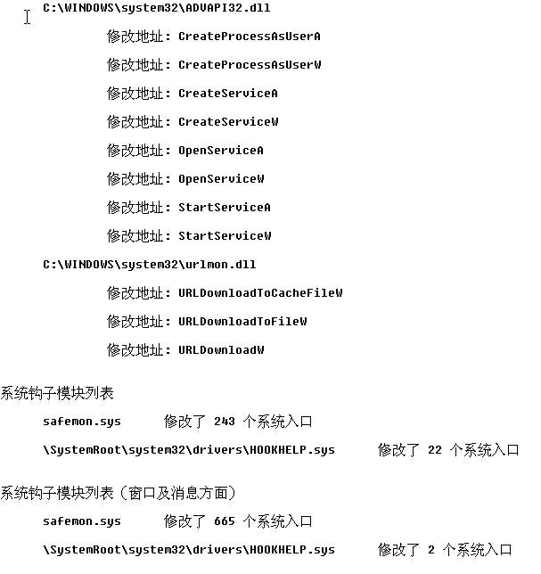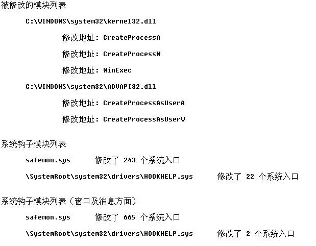 然后使用SRENG扫描。结果SRENG也不请示擅自就把一些入口点给恢复了。现在我也无法搞清楚那些被恢复的入口点是谁HOOK的,也不知道是瑞星杀软的还是瑞星防火墙的还是卡卡的还是我的清华同方的。下面的图就是SRENG扫描后再用江民进程查看器分析系统得到的日志。比上两图少了很多入口点。