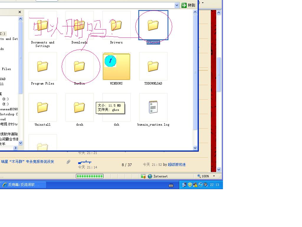 RAVBIN是瑞星的病毒隔离文件夹,那个中文名字的不是。KAV2007的文件夹如果没装卡巴的话可以删除