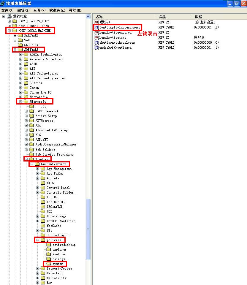 系统在每次登陆的时候会显示上一次登陆的用户的用户名,入侵者很可能会根据被显示出来的用户名获取登陆密码并且非法进入系统。此项的手工修复方法如下:运行注册表编辑器regedit.exe,修改键 HKEY_LOCAL_MACHINE\SOFTWARE\Microsoft\Windows\CurrentVersion\policies\system 中的值 dontdisplaylastusername,dontdisplaylastusername=0 为显示显示上一次登陆的用户的用户名, dontdisplaylastusername=1 为不显示显示上一次登陆的用户的用户名