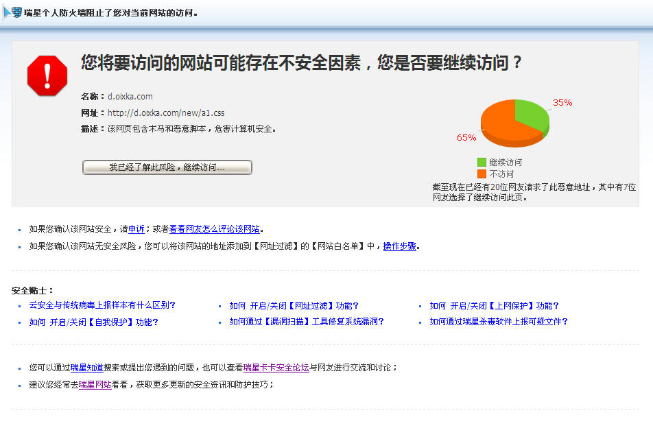个人认为 瑞星的是基于挂马行为的拦截 而卡卡是瑞星把用户反馈回来的挂马网站搜集起来禁止登陆