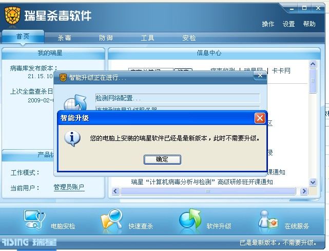 我家瑞星有一段时间没更新了,前几次更新说已是最新版本,没在意。今天更新还是这情况,上官网看版本已是21.24.10,而我家还是21.15.10。但