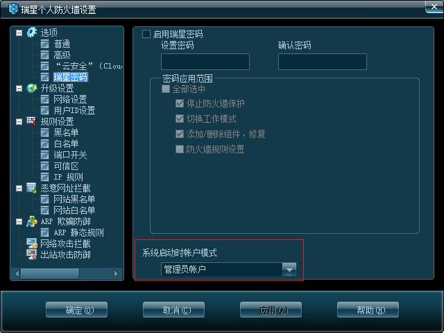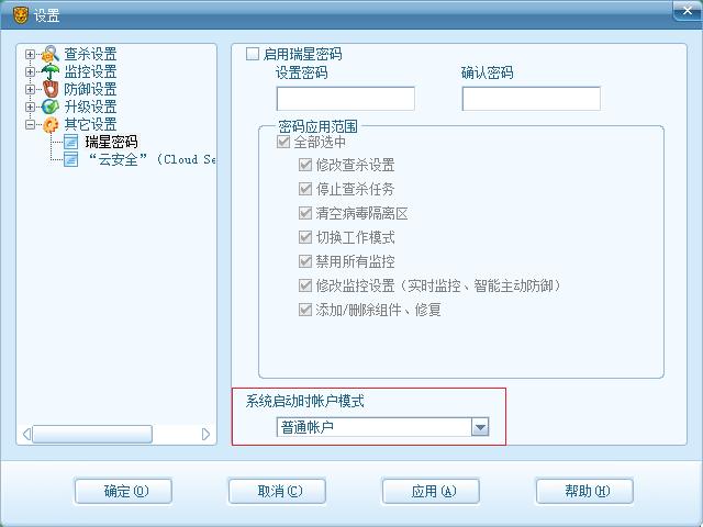 (A)其它设置——瑞星密码——启用瑞星密码打勾,系统启动时帐户模式:普通帐户