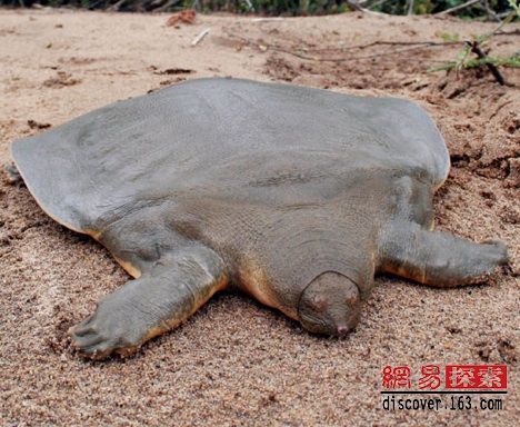 鼋属于巨型软壳龟,可以成长到大约2米长,重量可超过50公斤,多生长在内陆,在河流或溪水边觅食。鼋在中国是国家一级保护动物,分布于我国东南部、印度、东南亚以及新几内亚地区等。鼋的外形特征显著,其吻部极短,眼非常靠近吻端。一些成年个体背甲和头部带有浅黄色的散化状条纹。它可能是鳖科中形体最大的品种。