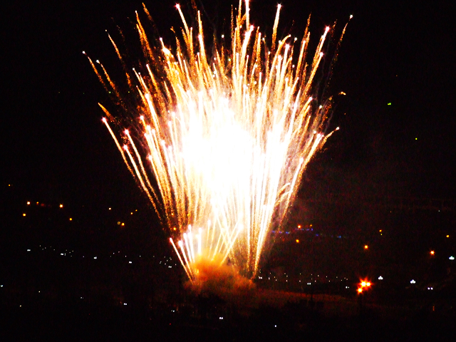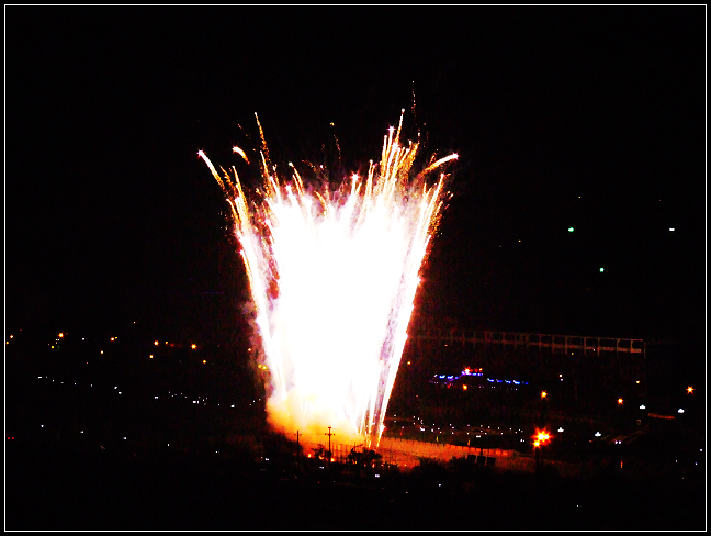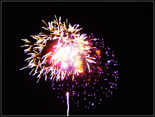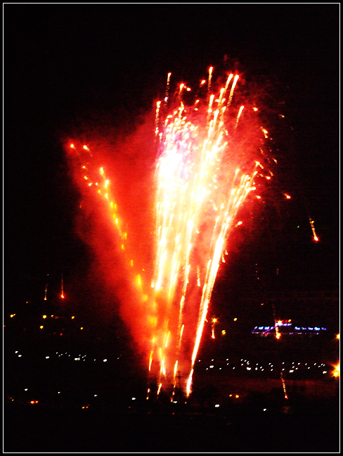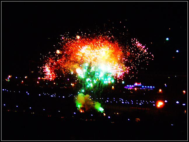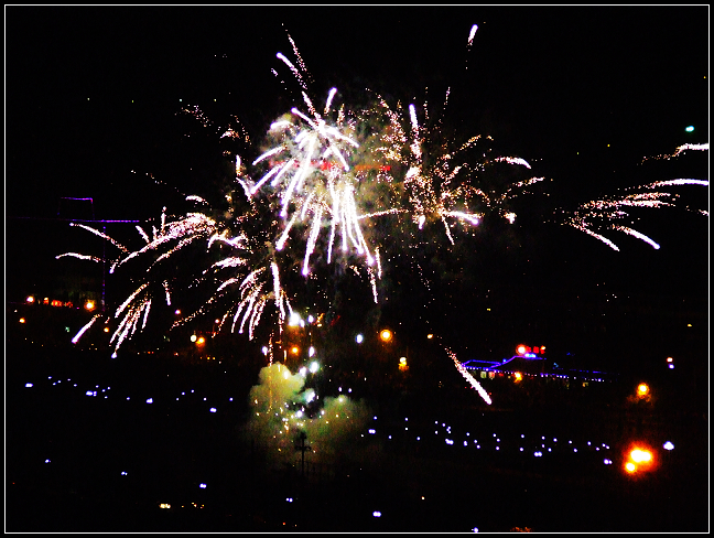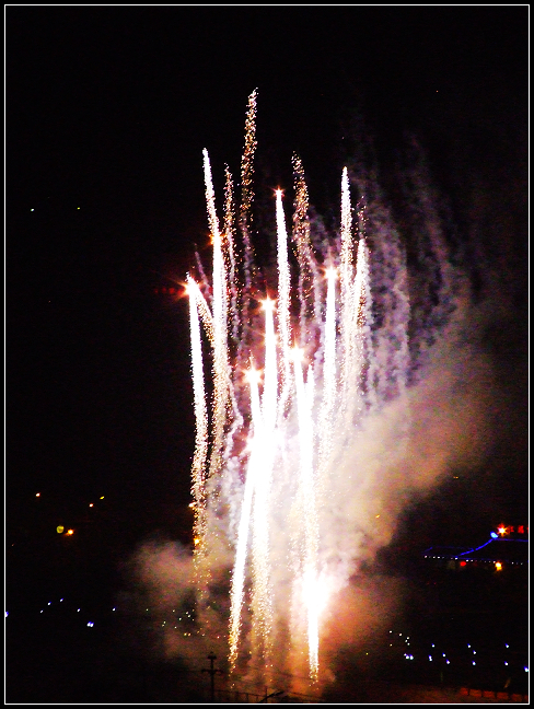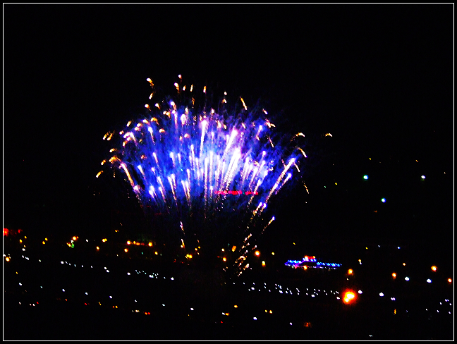 我也来凑个热闹,上几张我照的烟花照,我的主要是上些低空焰火,争取不和逍遥的片片打架,,,吼吼,我只是临时想去拍的,没有三脚架所以不能用逍遥的慢快门三脚架方法了,我使用的是手持快速快门大光圈加大曝光补偿加大ISO的方法(一般这样的方法只在拍摄高速运动的东西采用,比如高速路上的汽车),出来的效果相比较逍遥的,没有那么维美而且噪点很多,但是在抢拍有形烟花上确实比较好用。