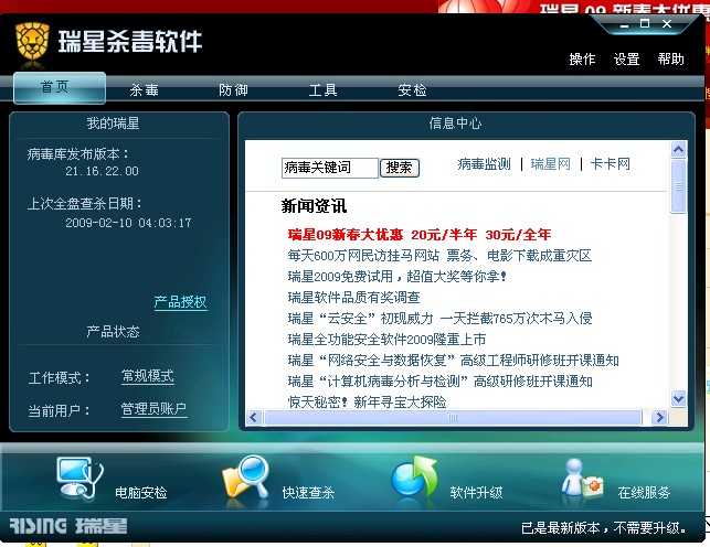 瑞星官方网上公布的是程序版本,而您看到的主界面中的是病毒库版本。