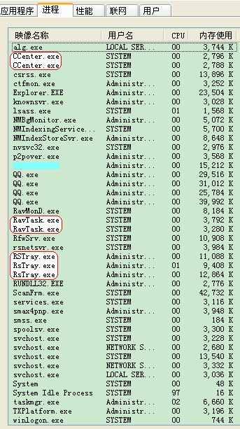 RsTray.exe有3个,分别为瑞星杀毒软件,防火墙,卡卡助手,其他相同的2个进程为杀毒软件和防火墙,是正常情况,不用担心。
