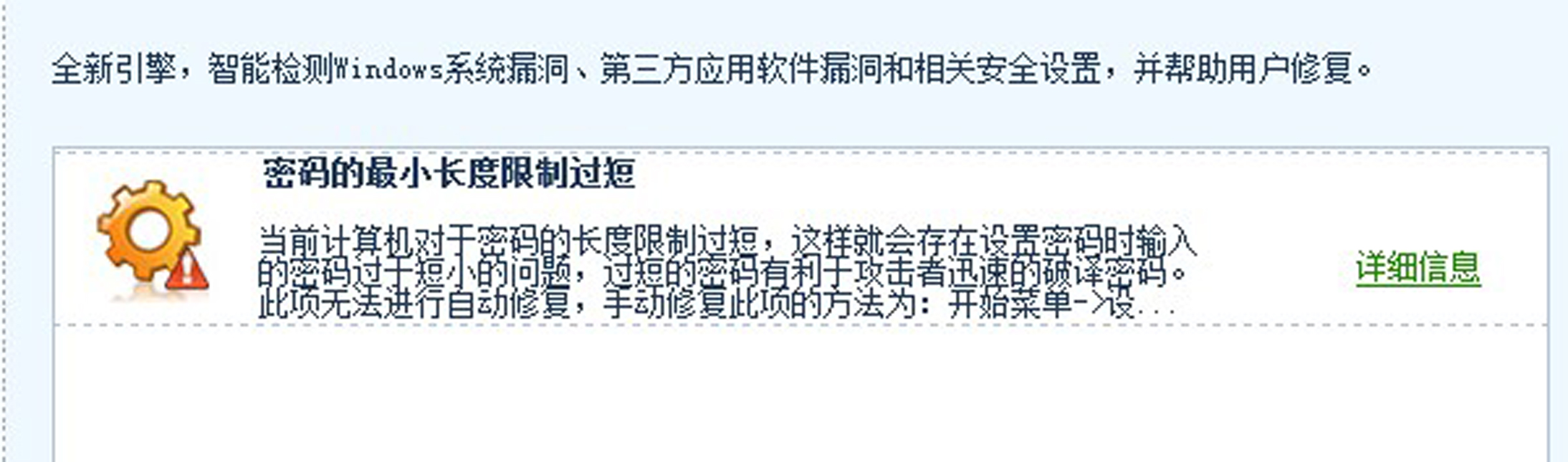 密码的最小长度是指给帐户设置的密码位数最少要达到多少,所起的只是一个提示作用。为了安全建议给帐户设置密码,至于这个密码的最小长度限制,因为home版的vista不具备本地安全策略,无法修改,但是对安全没有影响