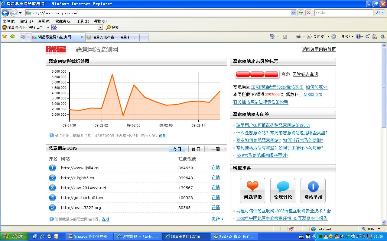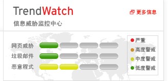 病毒疫情网中体现不出病毒的猖獗,不知道怎么回事,其次希望恶意网站监测网能与病毒疫情网合并,并在危险级别上也有所统一,这个可以参考一下趋势科技的的做法,将危险提醒设置成三个