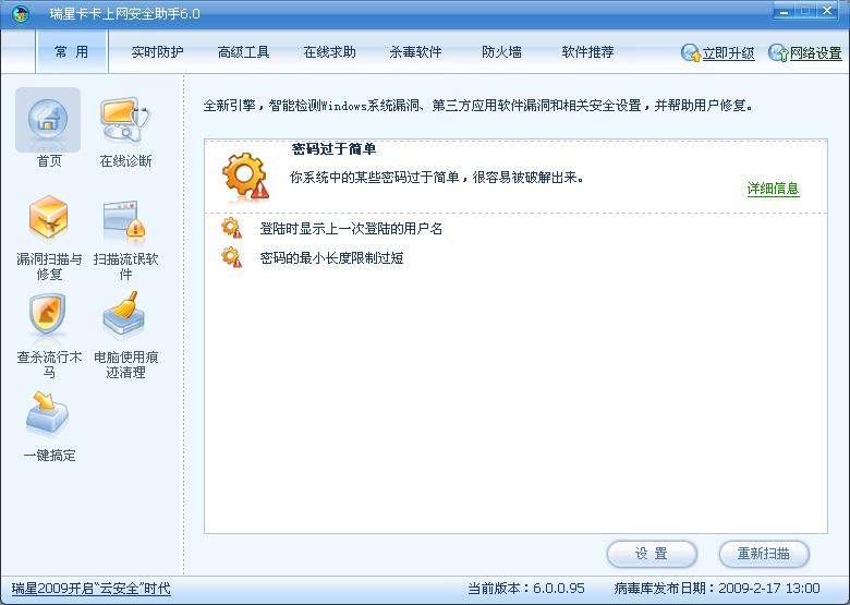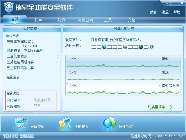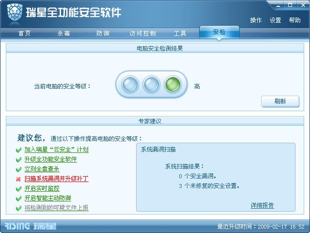 重装了系统,瑞星终于安装上了,也能正常升级了,