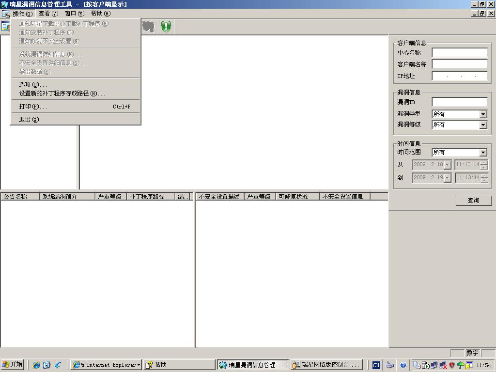 楼主要先确认系统中心的,以Rav开始的服务(共四项)均正常启动,而后进入管理控制台,先对所有客户端进行漏洞扫描,而后点击工具-漏洞管理工具-点击查询按钮后,会出现扫描出的漏洞信息,然后再点击菜单上的“操作”来进行下一步的操作。