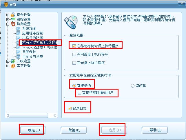 例如瑞星杀毒软件的详细设置》防御设置》木马入侵拦截(U盘拦截)》如下图设置
