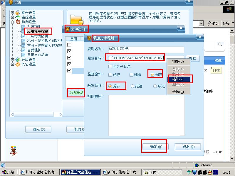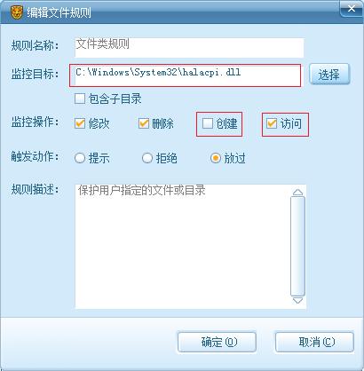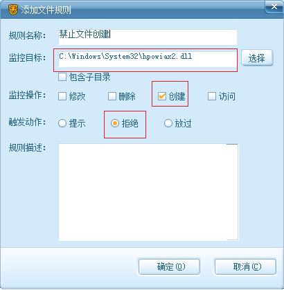 在弹出框中,监控目标,在选择里找到C:\WINDOWS\SYSTEM32\BECO748.DLL .然后在监控操作中勾选创建,取消另外3个选项。在触发动作中选拒绝。点确定。结果如下图(图7):