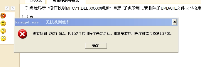一升级就显示 "没有找到MFC71.DLL,XXXXX问题" 重装 了也没用 ..我删除了UPDATE文件夹也没用