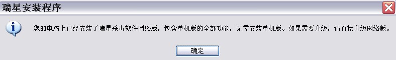 您的电脑上已经安装了瑞星杀毒软件网络版,保护单机版的全部功能,无需安装单机版。如需要升级,请直接升级网络版