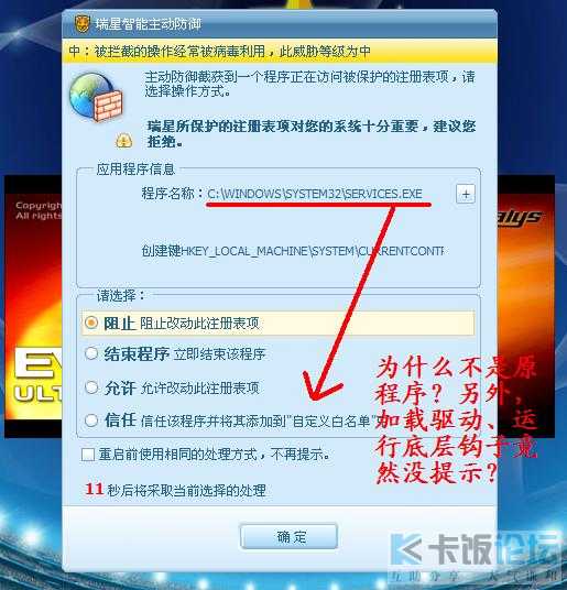 09-2-8 19:06 重要更新:有跟帖的朋友反映瑞星的主防表现与以上不尽相同,自己分析了下,应该是未勾选“自动放过签名程序”,所以,对于正版、完整、官方的软件,瑞星似乎能够准确提示。这里要特别再说明一下瑞星的主防问题:1、默认情况下,“自动放过签名程序”是勾选的,所以会造成很大的安全隐患;2、就算将以上勾选取消,也不是完美的,还是存在以上所述的漏洞。除去现在一堆的被恶意修改过的程序不说(这些程序往往冒充官方的,但却包含着威胁),即便你的合法程序被拦截了,但是调用的系统进程(这里是SERVICES.EXE)是以主调用者(即实现主体)的形式呈现出来的,“信任”之后的依然是软件调用的系统进程,还是会出现以上所述的隐患,除非一种情况,那就是每次运行一种底层软件,在弹出的警告中选择“A——信任;B——本次允许;C——.........”,我想这样的主防实在称不上智能了吧?我们不列举卡巴、EQ等复杂的主动防御软件,仅仅以PCT Firewall中包含简单的主动防御模块为例就足以证明瑞星的主防改进的地方仍然很多。
