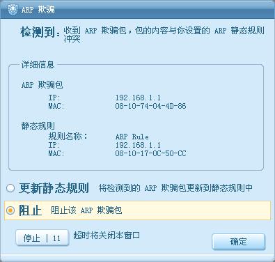在下面的静态规则中的MAC是我路由器上的MAC地址,上面的ARP欺骗包中的MAC我在局域网中没有找到相应的MAC地址的电脑!