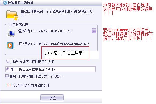若把explorer加入白名单,那此进程调用任何进程都不提示,降低了安全性!!!