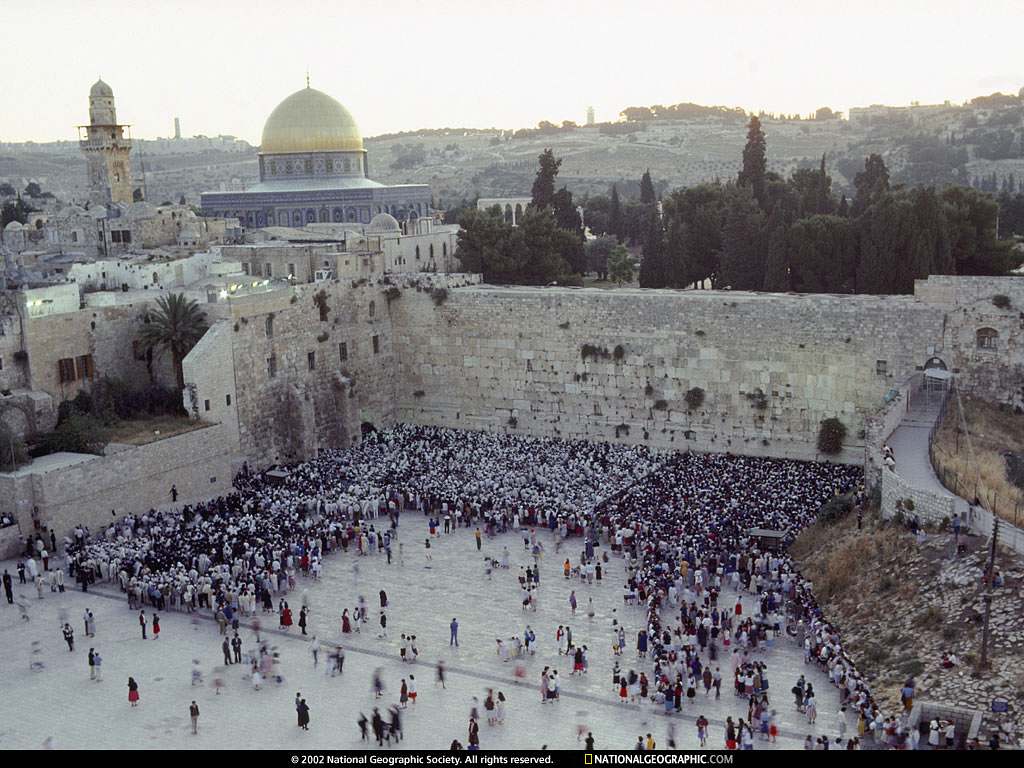 哭墙(上图)是犹太教最圣洁的祷告地,每天都有圣徒来访。许多男性祷告者穿着黑色衣服披着白色的祷告披肩在此聚集,一边大声的祷告,一边虔诚的磕头。女性祷告者则单独静默的祷告。