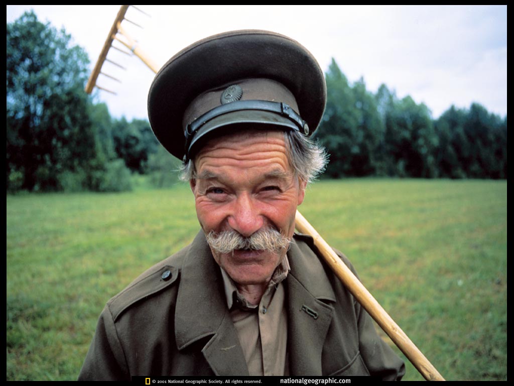 一个俄罗斯农民穿着旧军装和戴着旧军帽。