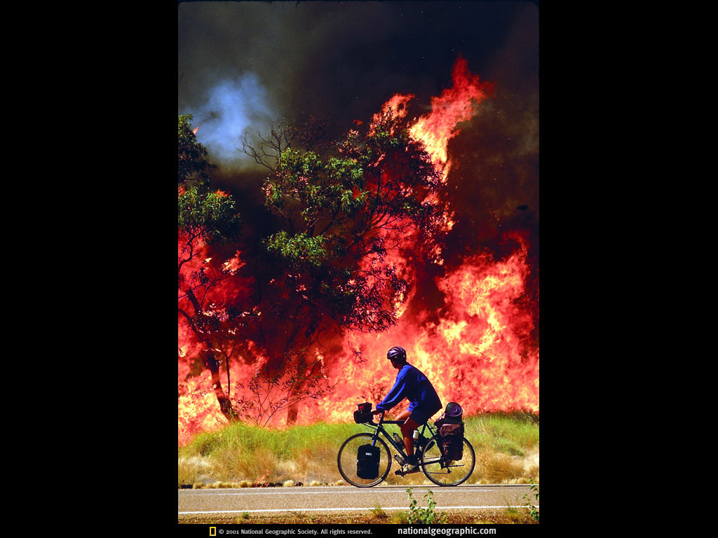 “在这中干燥的季节,一个闪电或一个烟头就可以把这个地方变成地狱。在霍尔斯克里克(Halls Creek)西部的这场大火,烫得快把我的头皮融化了。很快雨季就要来了,那会熄灭这场大火的,但我还得继续前进。”