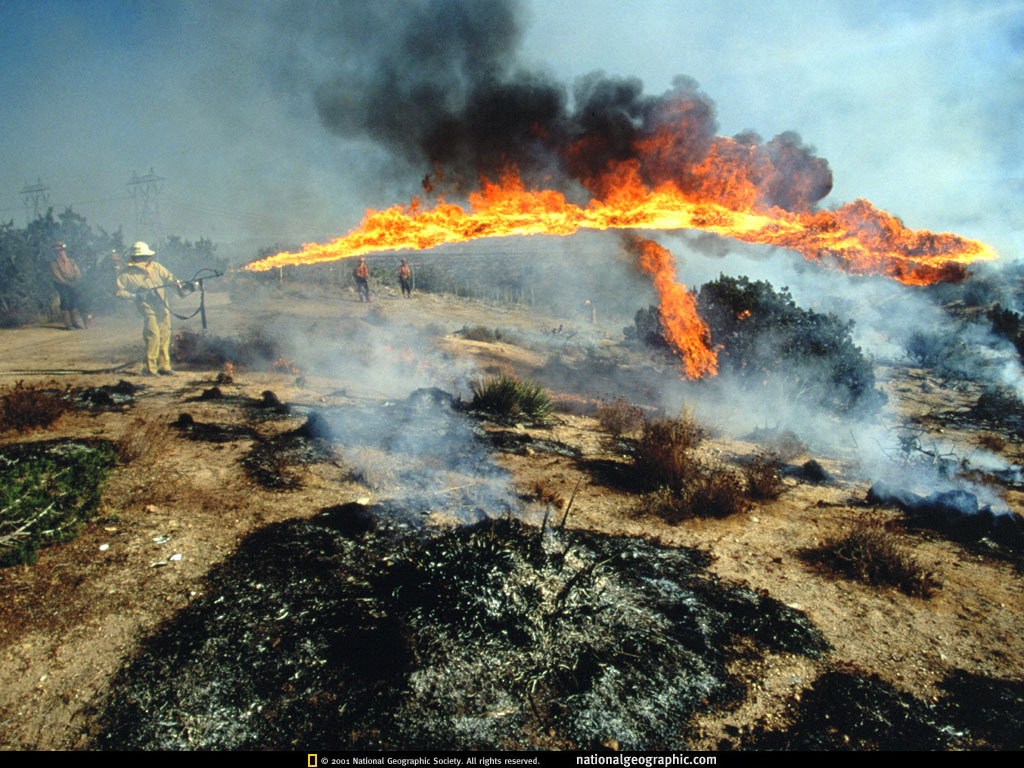 在加利福尼亚州南部,随着一阵炽热燃烧的汽油,护林人Jim Carter向沙漠灌木丛喷射火焰。在荒地附近逐渐增建的动植物栖息地会受到火灾的威胁,所以计划火烧有时候被用来预防森林火灾。