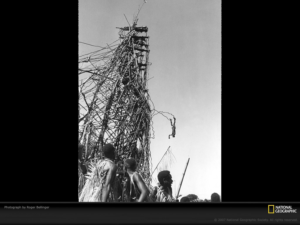 松软的土地,有弹性的藤蔓,当这名男子绑上的藤蔓绷直的时候,跳台的反作用力会减轻摇晃程度。他必须站在足够高的塔上,以免藤蔓太长导致不安全。