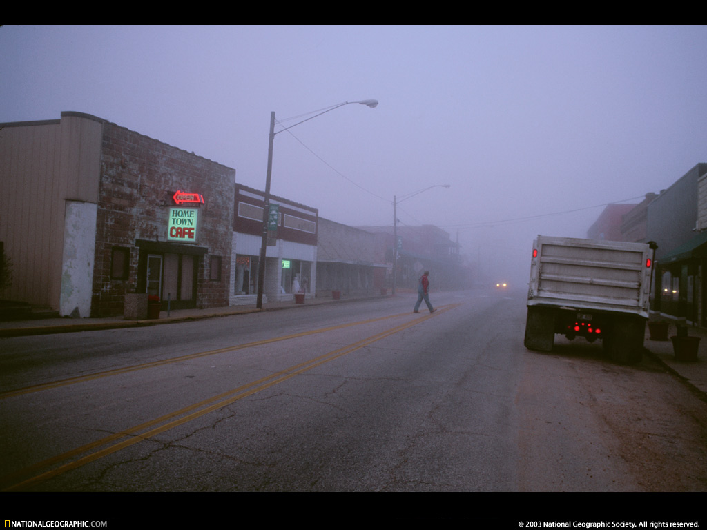 如果美国的每个人都能在地图上保持平衡的话,那么这个正在穿越斯蒂尔维尔大街的卡车司机一度跨立在地心引力的中心。