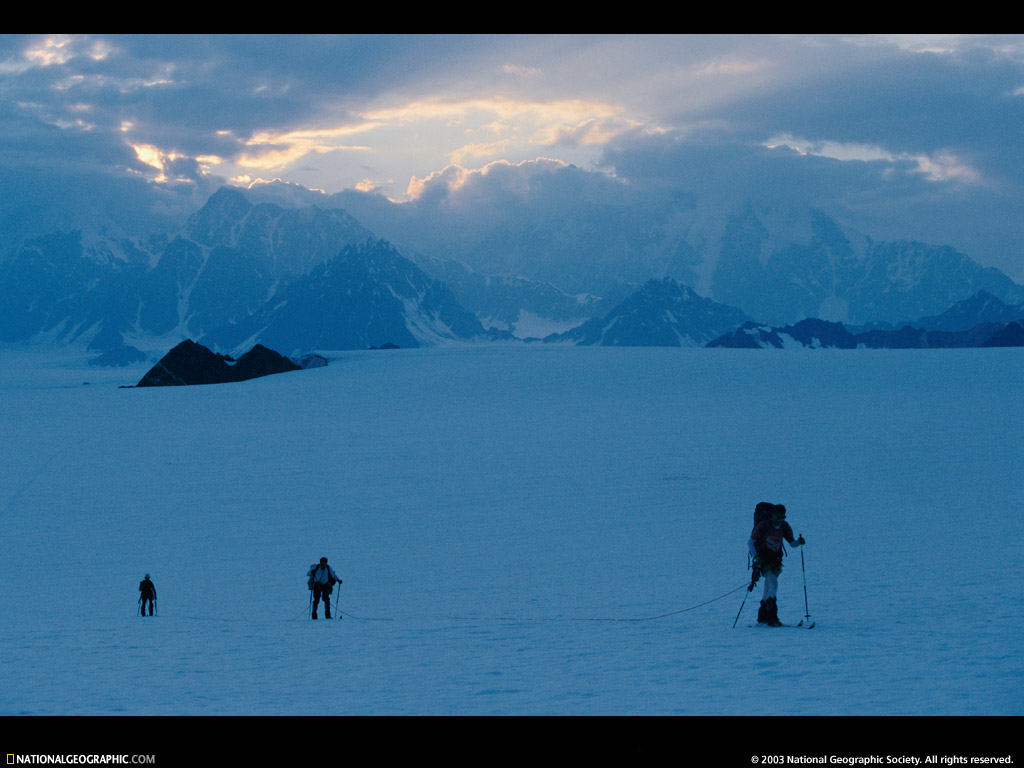 慢慢逼近的黑暗让人感觉寒冷,一队人从遥远的鲍尔迪山(Baldy)而来,艰难的行走着,鲍尔迪山在画面的左边很远的地方,画面的右边暗色的山脊是蝴蝶湾海滩(Butterfly Beach)。为了安全起见,他们用绳索将自己绑在一起。“我们可以看到大型洞穴,”(生物学家大卫)希克说道,“我们没法再冰雪覆盖的裂谷清楚的辨别方向。”在一千码(914米)开外的前方有营地,干燥的衣服,以及长达16小时的工作日的终点。