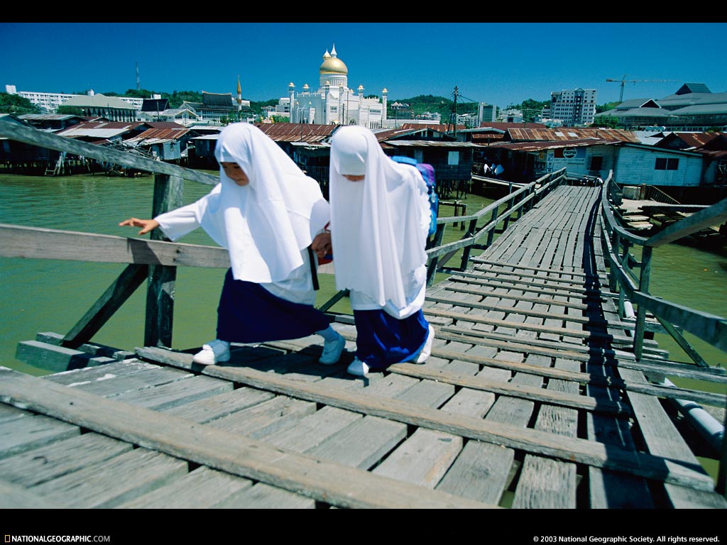 两个女孩从“水上村落”里的学校出来,走在回家的路上。文莱30万市民中有10%的人居住在水上的房子里。