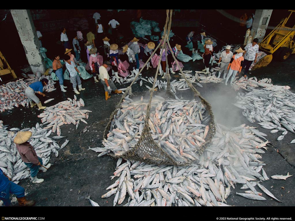 在台湾主要的海港,一艘冷藏船正在倾卸从印度尼西亚捕捞到的,为运输而冷冻起来的大量的鱼。专家警告捕鱼过甚会导致往后无鱼可捕。