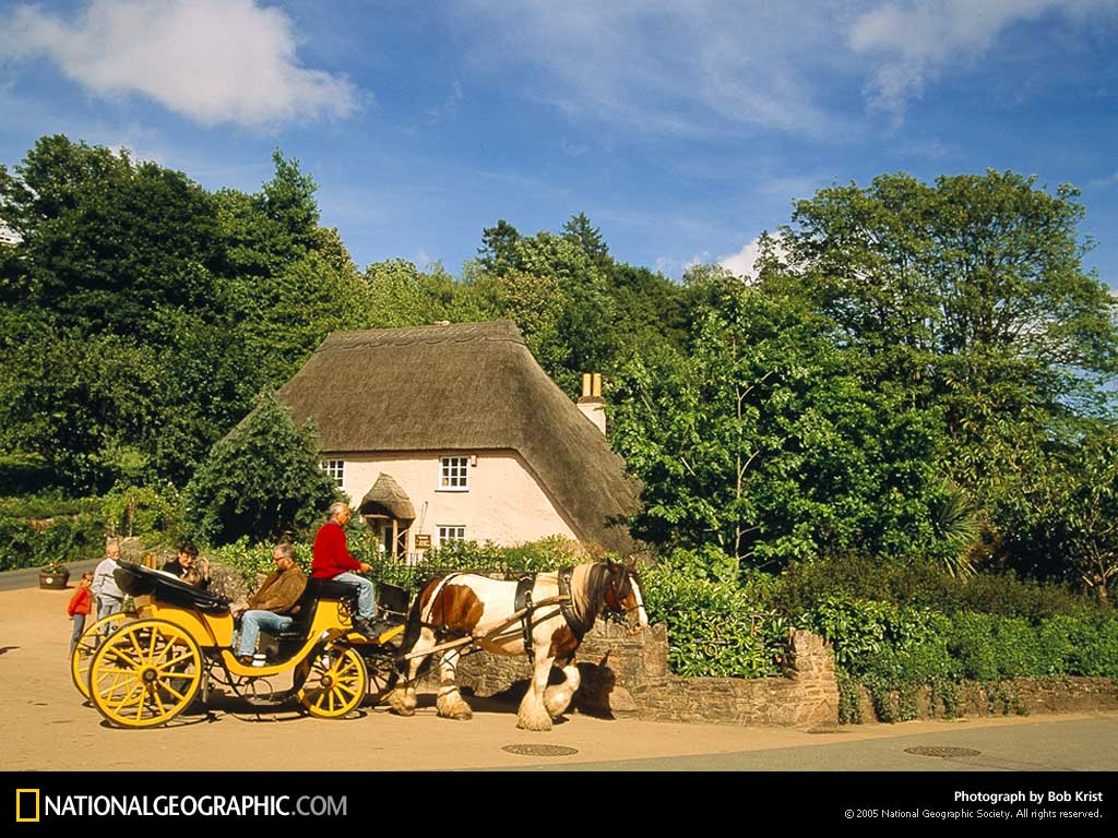 图为参观德文郡卡金顿的旅客们乘坐马车路过茅草屋顶的农舍。充满田园风光的德文郡拥有大量的农田,树林,沼泽,和海岸,长期以来一直作为英国城市生活的解毒剂。