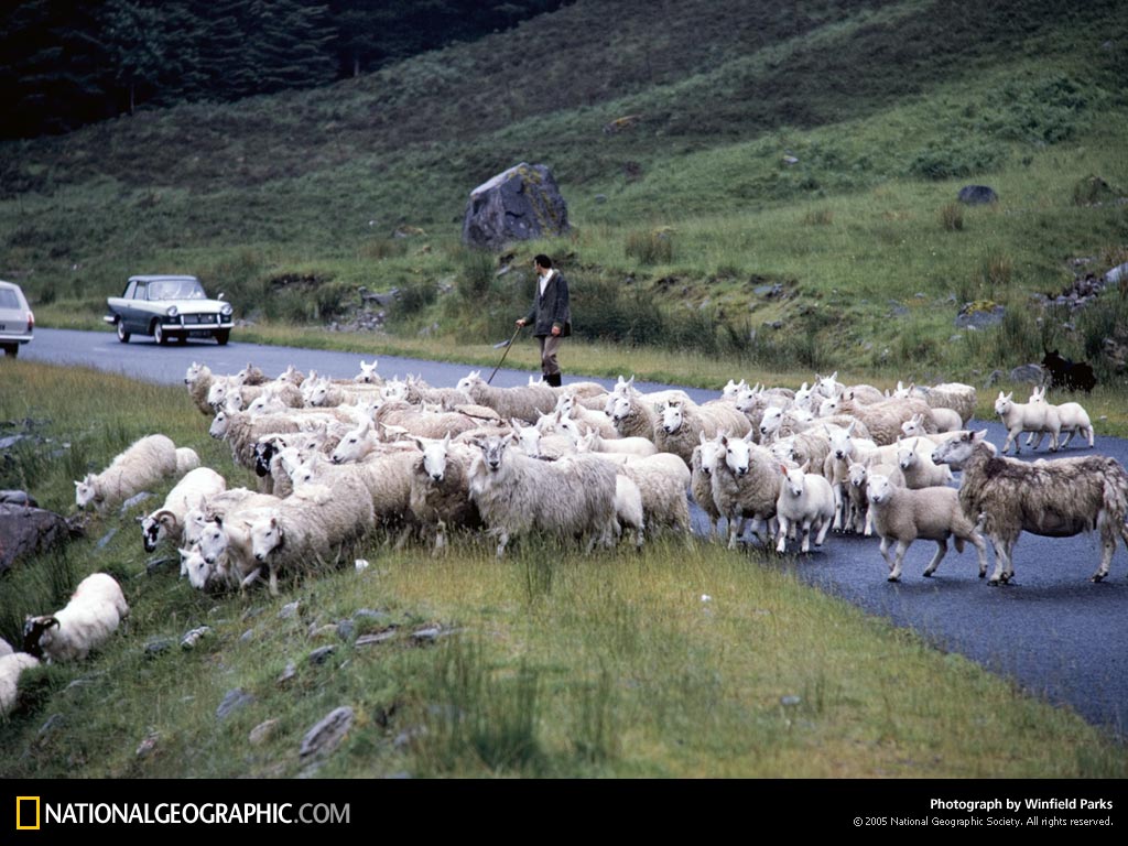 一群牧羊穿过位于苏格兰高地多山的峡谷和海湾中的一条公路。在18世纪,绵羊取代了牛成为农场的支柱,占据了这片高地。羊毛是当地收入的一个重要来源。