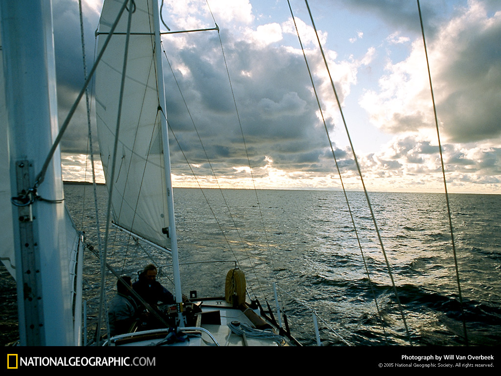 黄昏时分,暴风云在空中翻腾,一只帆船在密歇根湖上滑过。密歇根湖是密歇根州边境上五大湖中的一个。