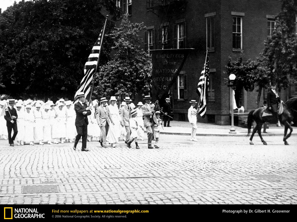 第一百六十二50国家地理学会的员工准备在3月的国旗日大游行, 6月14日,于1916年。随着第一次世界大战正在欧洲和日益紧张沿美墨边境,伍德罗威尔逊总统一起游行60000参加游行,只是一个事件,许多全国各地的打算再次向美国人民的理想国家。