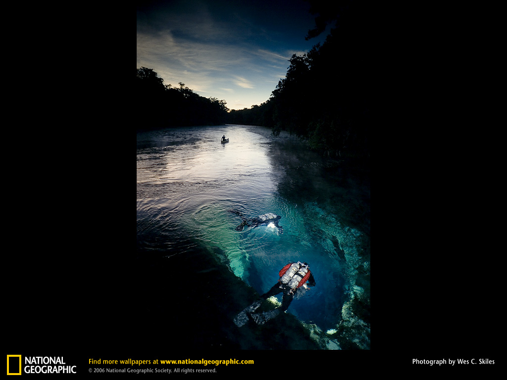 潜水者潜入圣达菲河床下的洞穴,在魔鬼耳朵的黑暗中消失。这只是佛罗里达州海底世界上百个洞口中的一个,探险家们逐步将它们发掘出来。