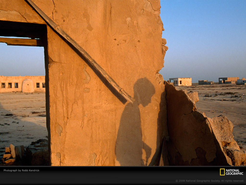 卡塔尔沙漠里到处散布着没有完工的房屋,落日的阳光将一个男孩的影子投映在一间废屋的墙上。卡塔尔是世界经济发展速度最快的国家之一。拥有石油和天然气拉动经济,2006年这里的人均收入超过6万美元,失业率低于百分之一。