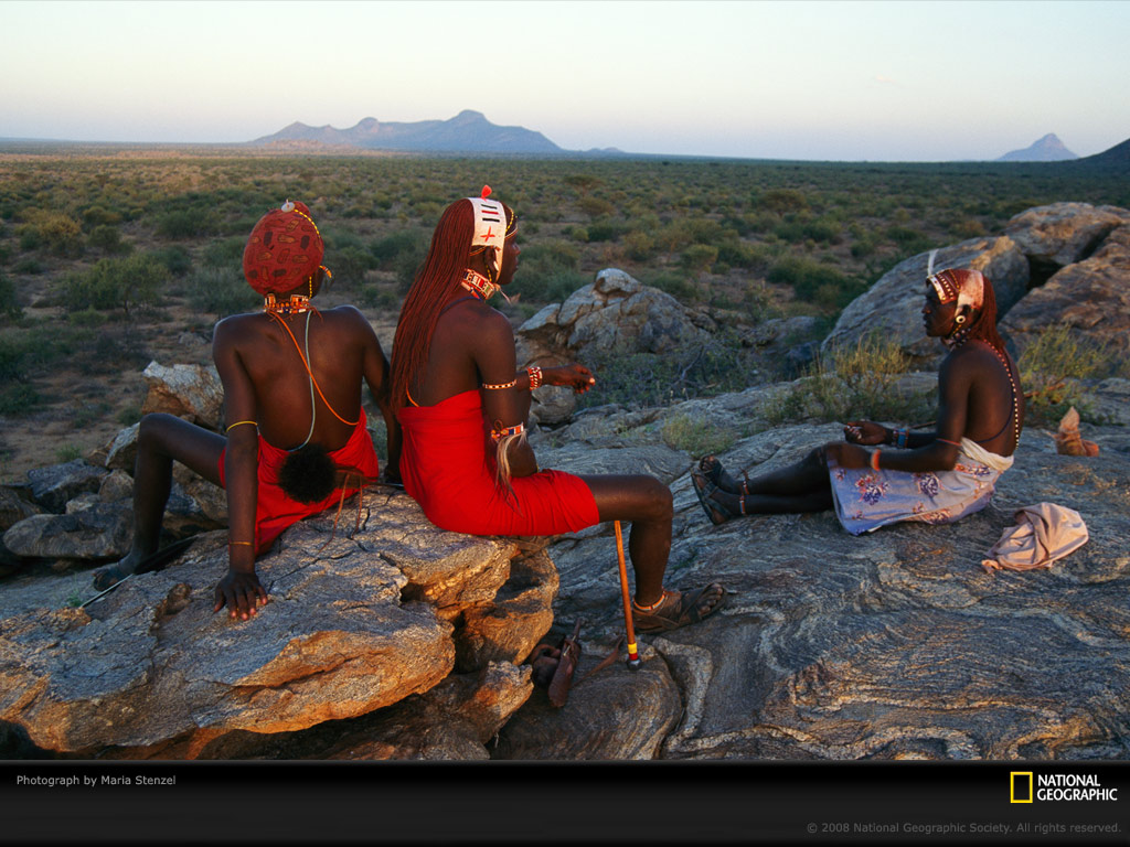 肯亚马萨比特北部地区的沙漠里,几个阿里尔部落勇士坐在凸起的岩石上休息。马萨比特居住着大约10000阿里尔人,即便他们共有的牧场面积在缩减,民族矛盾激化,政府不断施加压力将他们的“牛”文化融和到主流文化里,阿里尔人仍坚持保留着他们的游牧生活方式。