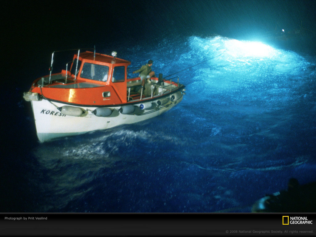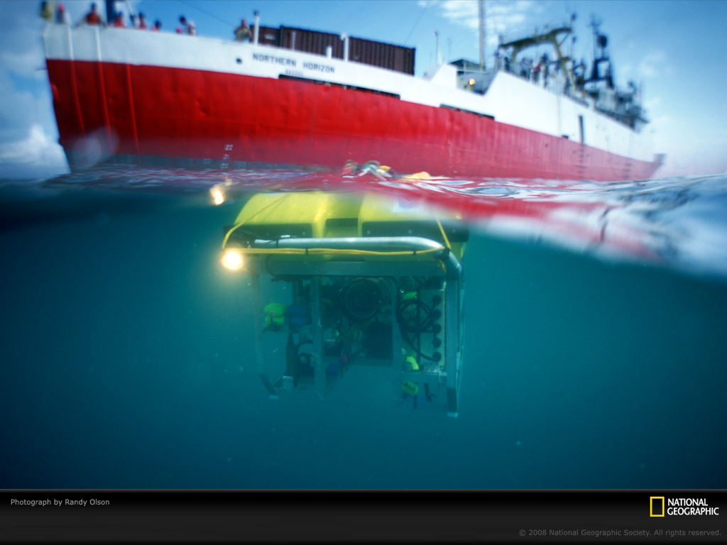 肩负着黑海科研工程的考古学家小组将一个可远程控制的名为“小力士”的潜水器从科研船上降入水中。当2000年拍摄这张照片时,这项工程在土耳其海域黑海深处发现了古老却保存得完好无损的遇难船。