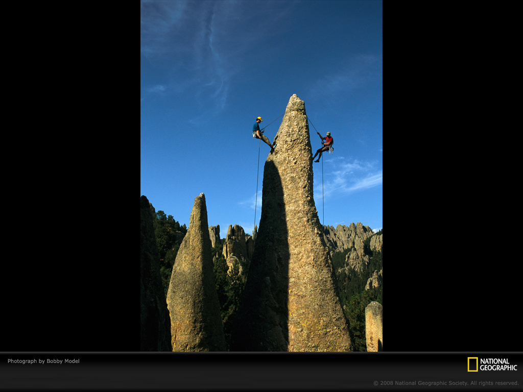 南达科他州黑岗石林里,攀岩者从三齿钉山尖下滑。针石林到处布满了被侵蚀过的花岗岩石柱,石塔和尖顶石山,颇受游客和攀岩者的青睐。