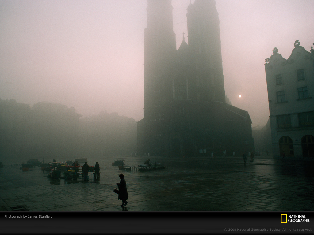 波兰克拉科夫的清晨,当商人们为一天的生意而做准备时,一小点太阳穿过晨雾显现在哥特式教堂的后面。这个风景如画的广场建于13世纪,是欧洲最大的公共广场之一。