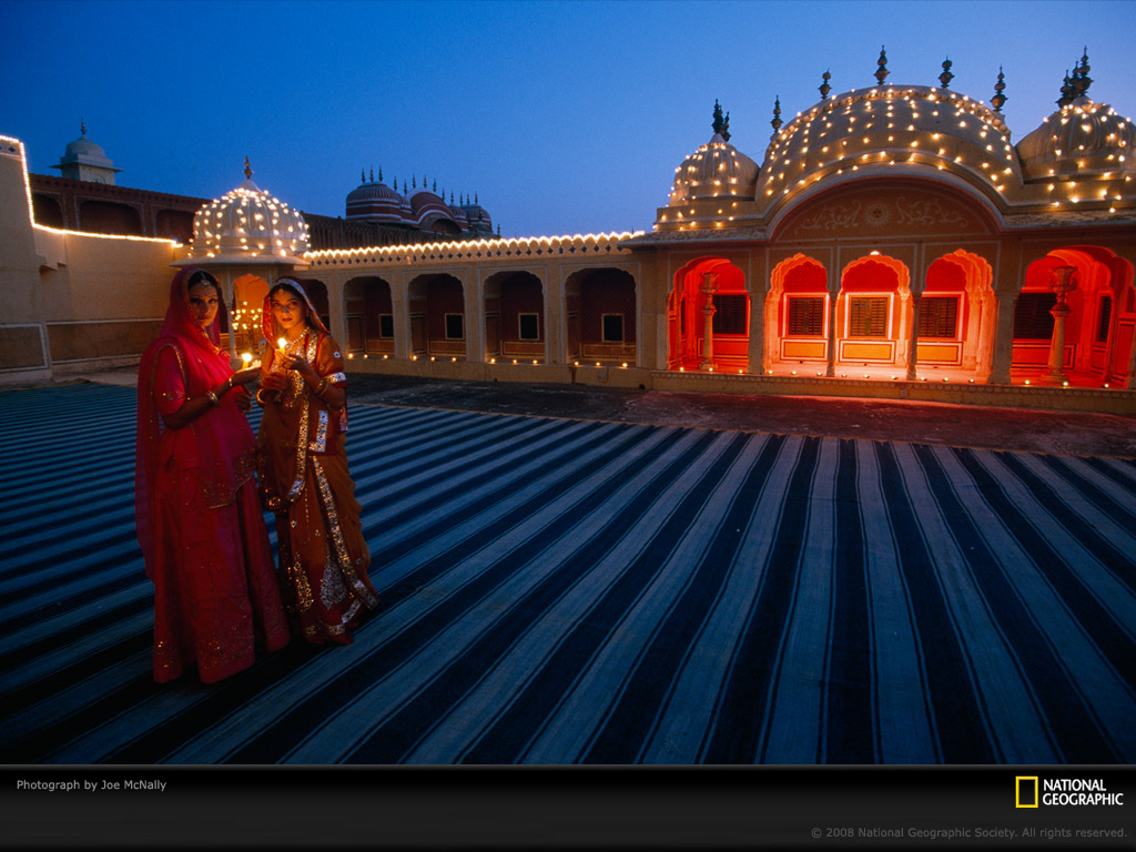 两个妇女在斋普尔王公(注:王公为印度对君候之敬称)的古代宫殿里庆祝排灯节——印度人的光明节。该节持续5天。排灯节期间,房屋和航道都点起蜡烛和油灯,既为庆祝善良战胜邪恶、光明战胜黑暗和知识战胜愚昧,也为纪念蜡烛和油灯是继篝火之后的最早的人工照明形式。