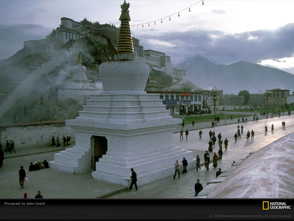 行人们在西藏拉萨有名的八廓街附近散步。宏伟的布拉格宫殿位于该街上面,离红山很近。很多人认为八廓街,这个曾经的精神家园,在中国政府引领的现代化进程的影响下,这个古老的领域失去了许多独特的藏族文化。