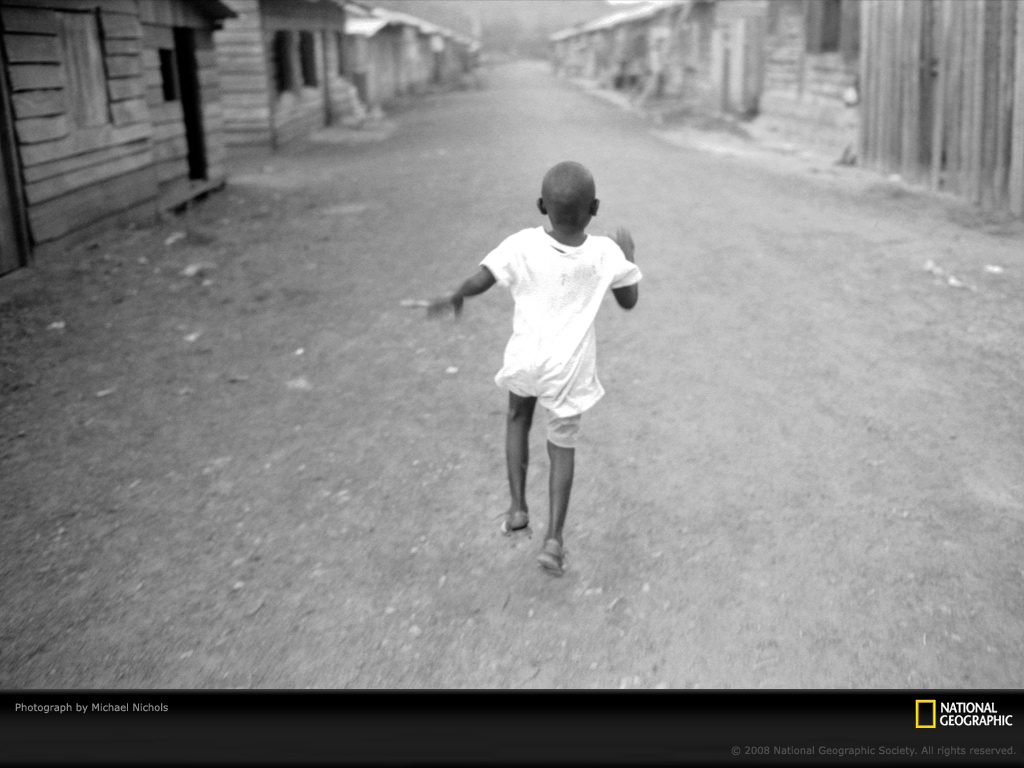 图为一个孩子穿过刚果共和国的一个萧瑟的村庄。自然资源保护着J. Michael Fay 徒步旅行了1200英里(1900公里)穿过非洲,进行为期一年的对非洲大陆上仍保留的野生环境的考察。Fay将自己的百万里程尽量避开城镇和村庄,而去广阔的荒地。但是他有时候也会路过一个乡镇去调查乡镇对附近野生动物数量的影响。