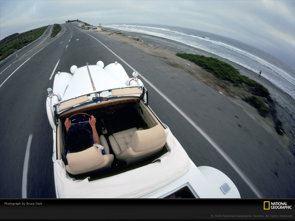 一位女士驾驶着一辆经典仿制跑车行驶在圣地亚哥附近的高速公路上。人们酷爱飚车,加州拥有超过15,000英里(24,140公里)的洲际高速路,沿途风景非常优美。