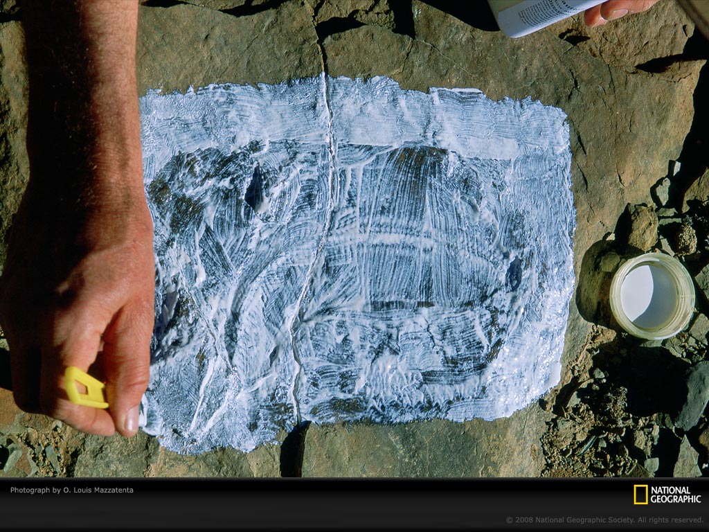 纳米尼亚奥斯镇,一位古生物学家在化石上刷制多层抛光乳胶浇铸了一个前寒武纪的化石模型。虽然这些化石遗体与世界上许多地方的化石相像,但是这些许许多多的前寒武纪的一类化石却更使科学家大伤脑筋。科学家们辨别不出这些化石到底是植物还是动物,还是别的什么东西。