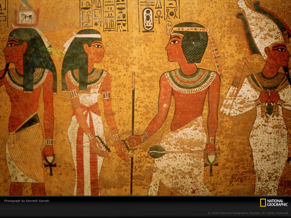 法老王图坦卡蒙的陵墓的北墙上描绘了图坦卡蒙去往天国的景象:女天神努特(左起第二个)迎接图坦卡蒙来到神的世界。努特张开的手掌中的黑色的锯齿状的标志象征着对法老王欢迎。