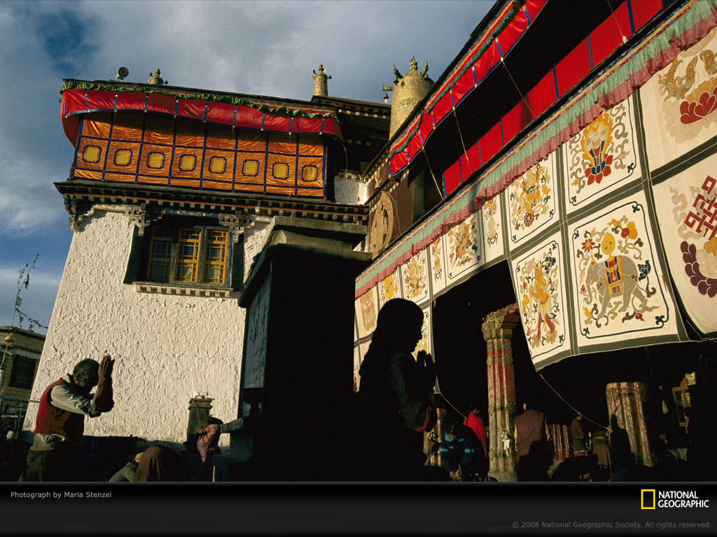 在中国西藏自治区拉萨市的大昭寺外,朝圣者们在祷告。这座庄严的寺庙里摆放着一些佛教中重要人物的雕像,其中包括著名的觉窝仁宝哲(西藏大昭寺的释迦牟尼像尊称)的坐势佛像。七世纪时期,藏族王室开始信奉佛教时,该佛像便被安放于此。