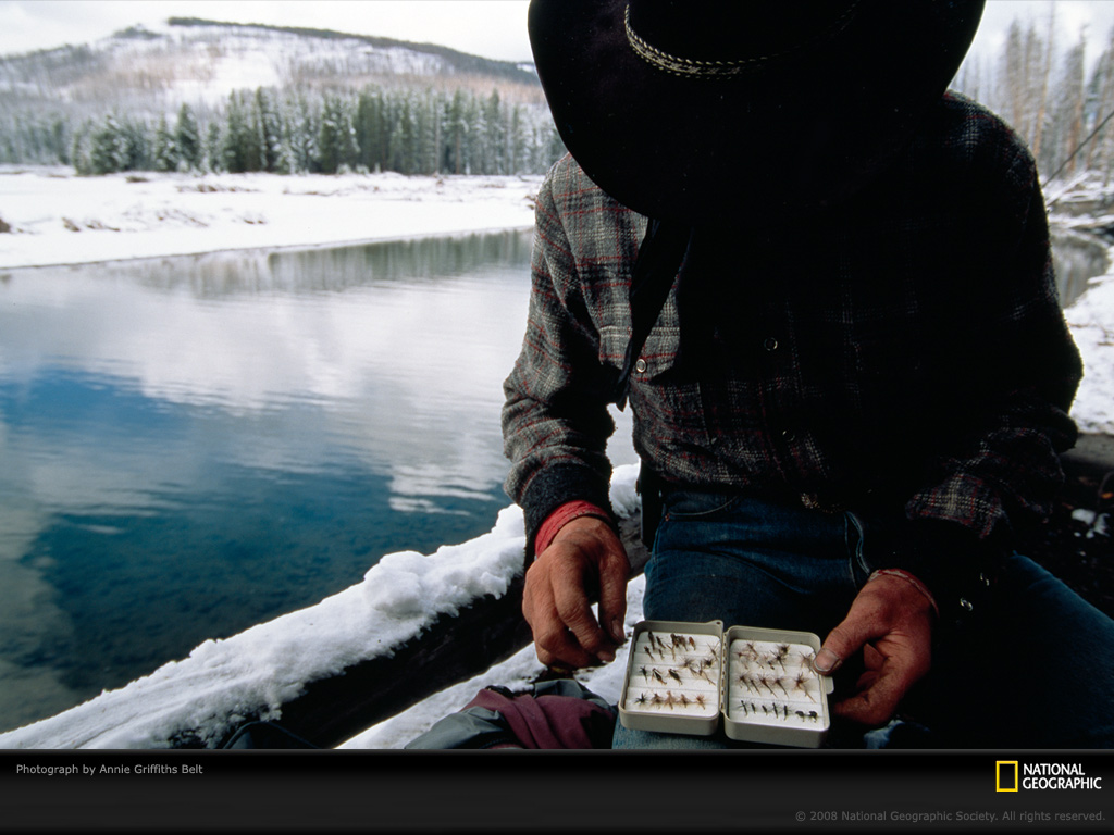 在黄石河那铺满积雪的河岸不远处,一个渔夫坐在渔船上检查他的鱼饵并陷入沉思。黄石河流经低处的48个州,是美国最长的河。该河穿过长达670英里(1078公里)的怀俄明州和蒙大拿州后在美国北达科他州流入密苏里河。