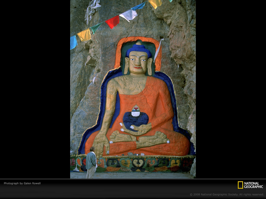 在西藏拉萨附近的一个朝圣地,一个游客敬仰的看着一尊雕刻在巨石中色彩鲜艳的释迦牟尼像,这尊佛像呈“触地印”的姿势并且拥有典型的长的耳垂,手里拿着一个化缘的钵盂。